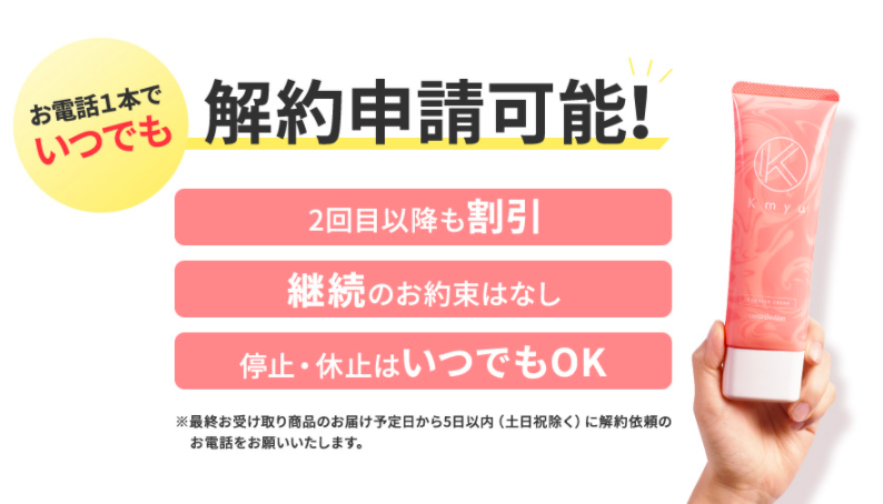 定期コースで申し込んでいても、ケミューの到着予定日から5営業日以内(土日祝除く)に解約の申請をすれば、回数縛りなく1回だけの利用であっても初回解約が可能なケミューのお得な定期コース。